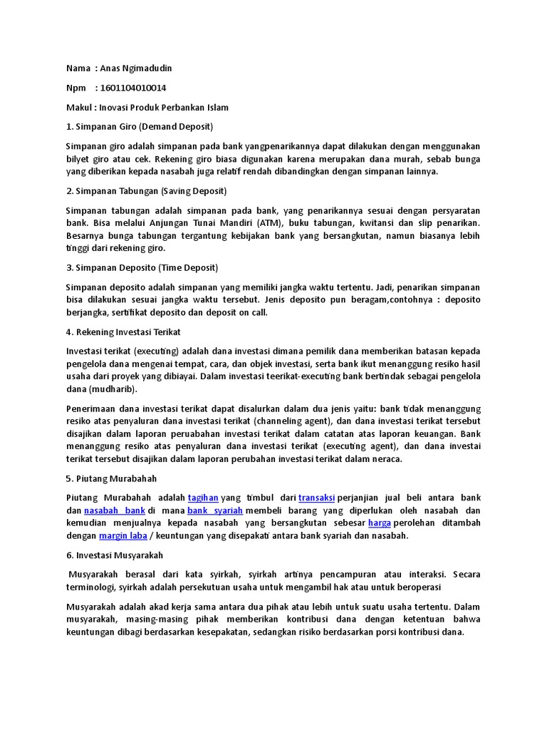 Dec 18, 2017 · yang dimaksud dengan giro wadiah adalah giro yang dijalankan berdasarkan akad wadiah, yakni titipan murni yang setiap saat dapat diambil jika pemiliknya menghendaki. Dalam konsep wadiah, yad al dhommanoh , pihak yang menerima titipan boleh menggunakan atau memanfaatkan uang atau barang yang dititipkan. Kfh online is available 24 hours including saturday, sunday and public holiday. Jun 06, 2021 · hadir dengan wajah baru, pospay agen siap menjadi solusi masyarakat dalam pencapaian inklusi finansial untuk setiap desa di seluruh tanah air. Aksi korporasi itu menjadikan paninbank sebagai bank pertama di indonesia yang melantai di bursa saham dengan kode pnbn. Dalam kredit konsumsi non kpr tidak termasuk penyaluran dana melalui kartu kredit dan kredit tanpa agunan (kta). Hal itu ditunjukkan dengan pertumbuhan kredit sebesar 12,2% pada akhir 2014 menjadi rp.530 triliun dari rp.472,4 triliun pada periode yang sama tahun sebelumnya, dengan rasio npl terjaga di level 2,15 %. Bank mandiri terus memperkuat peran sebagai lembaga intermediasi untuk mendorong perekonomian nasional. Paninbank dapat terus tumbuh dan memantapkan operasionalnya meskipun diterpa oleh berbagai macam situasi perekonomian, salah satunya ialah saat krisis ekonomi yang melanda indonesia pada 1998. Setoran dengan warkat cek, bilyet giro, wesel, dan sejenisnya akan dikreditkan ke dalam rekening tabunganku pada hari yang sama sejak diterimanya warkat tersebut, namun dana yang telah dikredit tersebut bukan merupakan dana efektif yang dapat langsung ditarik oleh penabung (floating). Deposit pelanggan dan pendapatan diterima di muka pendapatan yang diterima di suatu periode, oleh perusahaan hanya boleh diakui sejumlah yang bisa dihubungkan dengan beban/biaya yang. Apr 20, 2020 · berbeza dengan simpanan biasa, ssp adalah satu simpanan berbentuk pelaburan patuh syariah yang menawarkan pulangan dividen setiap tahun. Sebelumnya, aplikasi ini dikenal dengan nama agen posfin.